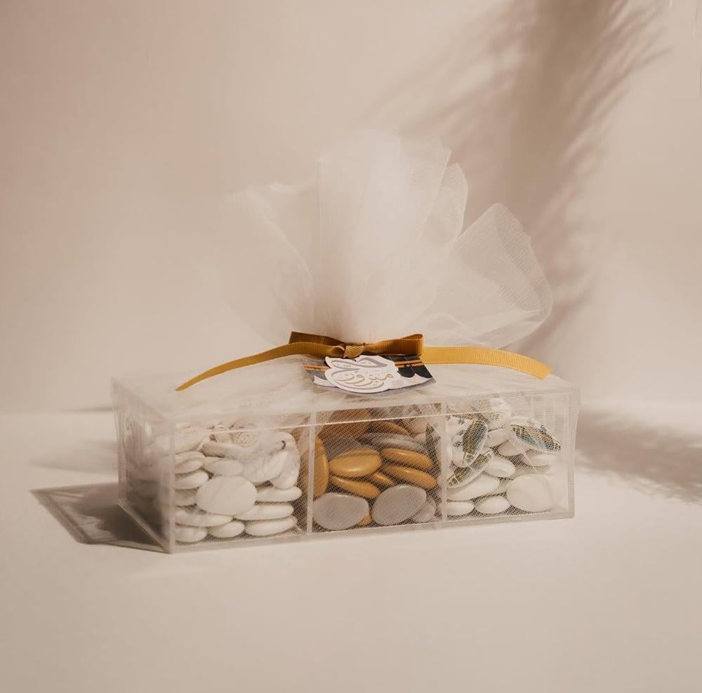بوكس أكريلك مُقسم يحتوي على حبات الملبس، مغلف ومزين بعباراتك وثيمك الخاص للتخرج، ليكون هدية راقية أو إضافة مميزة تضفي طابعاً شخصياً على احتفالكم بالنجاح.