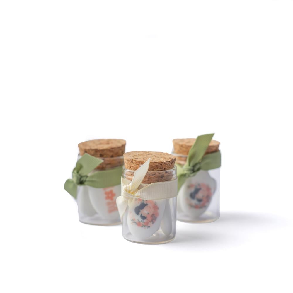 قنينات زجاجية صغيرة تحتوي على حبات الملبس، مثالية للتوزيعات، مزينة بثيمك الخاص لتضيف لمسة أنيقة ومميزة على مناسباتك.